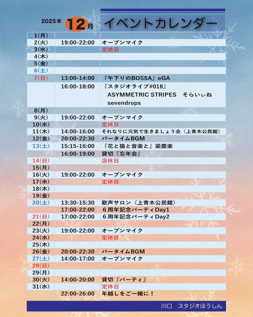 ほぼ月に1回、休日の午後に開催する、少しゆったりした音楽イベント。